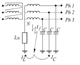 Une réactance accordée sur les capacités du réseau est volontairement intercalée entre le point neutre et la terre de sorte qu'en présence d'un défaut à la terre, le courant dans le défaut est nul.