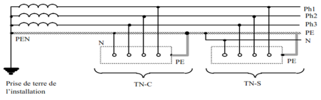 Le neutre et le conducteur de protection sont CONFONDUS. Ce type de schéma est interdit pour des sections de conducteurs inférieurs à 10 mm2; Le conducteur PEN (Protection et Neutre) ne doit jamais être sectionné.