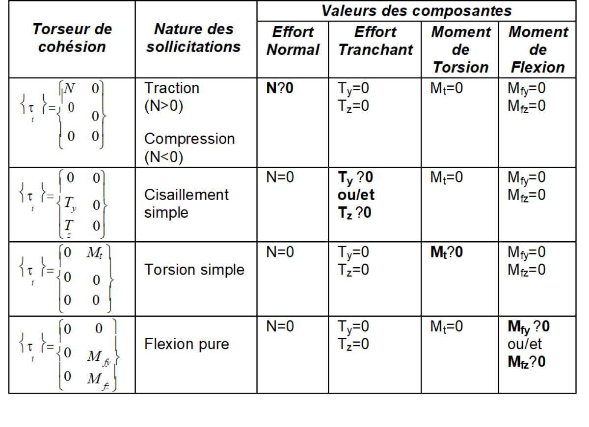 Les tançons A1 et A2 exerçaient l’un sur l’autre des actions qui maintenaient la cohésion entre les deux parties. Ces actions peuvent être représentées par un torseur appelé torseur des efforts intérieurs ou torseur de cohésion