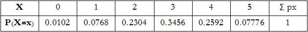 اذا كان من المعلوم ان نسبة الشفاء من مرض معين باستخدام دوء معين هي 60 % اذا تناول هذا الدواء 5 مصابين بهذا المرض واذا عرفنا المتغير العشوائي X بانه عدد المصابين الذين يستجيبون لهذا الدواء(حالات الشفاء).