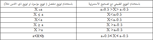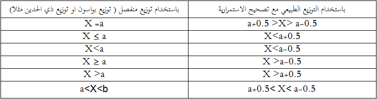 الجدول التالي يوضح متى يجب علينا إضافة أو طرح 0.5 لقيمة ، بناء على نوع الاحتمال الذي تريد الحصول عليه.(2)[2] [3]