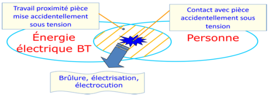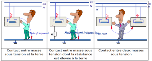 C'est le contact des personnes avec des masses mises accidentellement sous tension. Cette mise sous tension accidentelle résulte de la défaillance de l'isolation d'un appareil amenant un défaut d'isolement.
