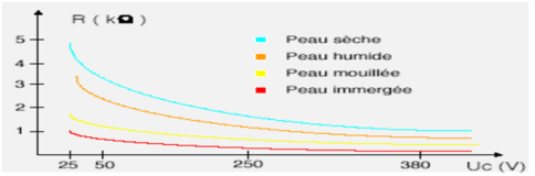 La résistance totale du corps humain décroît rapidement lorsque le courant augmente.