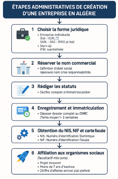 La Démarche Entrepreneuriale et la Création d'une Start-up en Algérie3. La démarche Entrepreneuriale La démarche entrepreneuriale est un processus structuré qui transforme une idée en une réalité économique (entreprise). Elle implique plusieurs étapes logiques, chacune étant essentielle pour la réussite du projet.3.1 De l’idée à l’opportunité L’idée est souvent la première étincelle : elle peut naître d’une passion, d’une expérience personnelle, d’une observation d’un problème non résolu, etc.Transformer une idée en opportunité nécessite :Évaluer la faisabilité technique et économique.Vérifier qu’il existe une demande réelle sur le marché.S'assurer que le projet est innovant ou qu’il propose une valeur ajoutée.Outils utiles : Brainstorming, SWOT (forces, faiblesses, opportunités, menaces), Canvas Business Model. Exemple : Une idée d'application mobile pour faciliter la commande de produits locaux devient une opportunité si elle répond à un besoin mal couvert.3.2 L’innovation L’innovation est la capacité d'introduire quelque chose de nouveau ou d’amélioré. Elle peut concerner :Le produit (nouvelle fonctionnalité).Le processus (nouvelle méthode de fabrication).Le modèle économique (nouvelle façon de vendre).En Algérie, l’innovation est un critère important pour les start-ups, soutenue notamment par le Ministère de l’Économie de la Connaissance.Astuce : Protéger son innovation avec un brevet, un dépôt de marque ou un modèle enregistré.3.3 L’analyse du marché Analyser le marché consiste à comprendre l’environnement dans lequel l'entreprise évoluera :Étudier la demande : Qui sont les clients ? Quels sont leurs besoins ?Analyser l’offre : Qui sont les concurrents ? Quelles sont leurs forces/faiblesses ?Identifier les tendances : Quelles évolutions sociales, technologiques, économiques ou politiques influencent le marché ?Techniques utilisées : Enquêtes, entretiens, questionnaires.Études documentaires (rapports, statistiques, études sectorielles).Objectif : Définir un positionnement clair et un avantage concurrentiel.3.4 Le Plan d’affaire (Business Plan) Le Business Plan est un document clé qui présente :Le projet (idée, mission, vision).L'étude de marché et le positionnement.Le modèle économique (comment générer des revenus).La stratégie de développement (marketing, production, RH).Le plan financier (investissements, prévisions de chiffre d’affaires, de rentabilité).Le montage juridique (forme de l'entreprise : SARL, SPA, etc.)Pourquoi est-il essentiel ? Convaincre les investisseurs, banques ou organismes de soutien.Guider les actions de l’entrepreneur.3.5 Le Financement Créer une entreprise nécessite souvent des ressources financières :Sources de financement : Apport personnel (capital de départ).Famille, amis (love money). Banques (prêts bancaires classiques ou islamiques).Programmes de soutien algériens (ANSEJ, ANGEM, CNAC).Business Angels ou fonds de capital-risque.Subventions et concours pour start-ups innovantes.Important : Avoir un plan de trésorerie réaliste pour éviter les crises de liquidité.3.6 Les Partenaires : Les partenaires sont essentiels pour renforcer la crédibilité et la capacité opérationnelle : Partenaires commerciaux (fournisseurs, distributeurs).Partenaires financiers (banques, investisseurs).Partenaires technologiques (laboratoires, universités, centres de recherche).Institutions d'accompagnement (incubateurs, accélérateurs, chambres de commerce).Bénéfices d'un bon partenariat : Mutualiser les ressources.Accélérer l’accès au marché.Partager les risques.4. Étapes administratives de création d'une entreprise en Algérie Créer une start-up en Algérie suit un processus administratif spécifique.Voici les étapes principales :4.1 Choisir la forme juridique Entreprise individuelle (personne physique).Société (personne morale) : EURL (Entreprise Unipersonnelle à Responsabilité Limitée).SARL (Société à Responsabilité Limitée).SPA (Société par Actions).Start-up labellisée (label Start-up délivré par le Ministère de l'Économie de la Connaissance).Remarque : Pour obtenir des avantages spécifiques aux start-ups (exonérations fiscales, accompagnement), il faut demander le Label Start-up.4.2 Réserver le nom commercial Se rendre au Centre National du Registre du Commerce (CNRC).Vérifier la disponibilité du nom.Réserver le nom commercial en ligne via le site sidjilcom.cnrc.dz.4.3 Rédiger les statuts Établir les statuts juridiques de l’entreprise (définition de l’objet social, répartition du capital, responsabilités des associés).4.4 Enregistrement et immatriculation Déposer un dossier complet auprès du CNRC :Statuts signés.Copie de la carte d'identité nationale.Certificat de résidence.Justificatif d'adresse du siège social (bail, titre de propriété).Paiement des frais d'enregistrement.Délai moyen : 1 à 2 semaines.4.5 Obtention du NIS, NIF et carte fiscale NIS :Numéro d'Identification Statistique. NIF : Numéro d'Identification Fiscale.Carte fiscale délivrée par la Direction des Impôts.4.6 Affiliation aux organismes sociaux S’inscrire à :CASNOS (Caisse Nationale de Sécurité Sociale des Non-Salariés) pour l’entrepreneur individuel.CNAS (Caisse Nationale des Assurances Sociales) pour les salariés éventuels.4.7 Demander le Label Start-up (facultatif mais conseillé) Déposer la demande sur la plateforme officielle startup.dz.Conditions : Projet innovant.Moins de 7 ans d’existence.Chiffre d'affaires annuel plafonné.Éligibilité aux avantages fiscaux et au fonds Algérien d’investissement pour Start-ups (Algerian Startup Fund).
