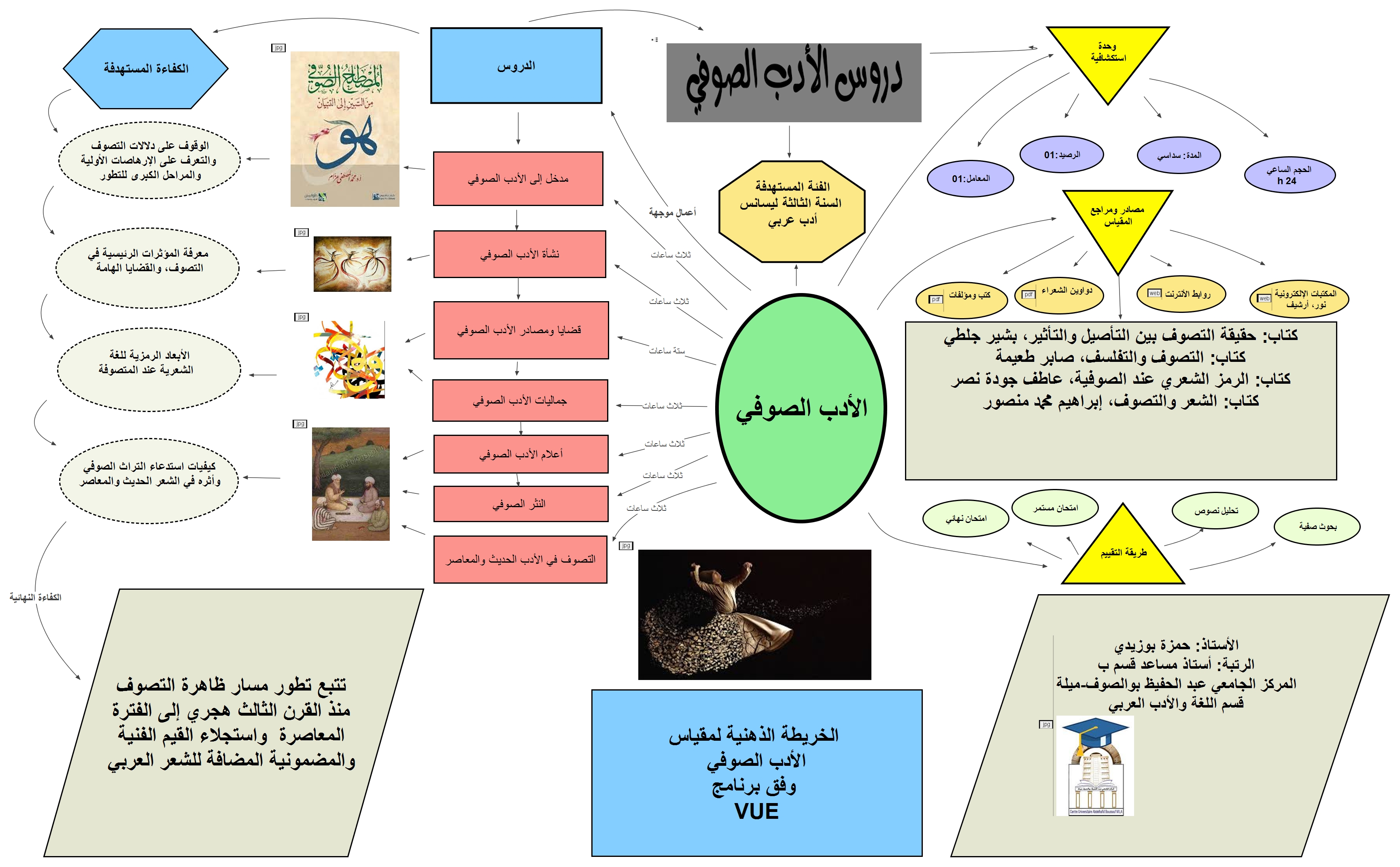 مقياس الأدب الصوفي هو عبارة عن مقياس أعمال موجهة في السداسي الخامس، يندرج المقياس في الوحدة الاستكشافية برصيد 01، ومعامل 01. يحتوي على مفاهيم نظرية وأنشطة تقييمية في الوقت نفسه، ويمتحن فيه الطالب امتحان مستمر وامتحان نهائي في نهاية السداسي. يتطرق مقياس الأدب الصوفي إلى العلاقة القائمة بين التصوف كحركة فكرية والأدب كتخييل إبداعي، ليرصد التاريخ الطويل للأدب الصوفي منذ نهايات القرن الرابع الهجري إلى الزمن المعاصر، كما يبحث المقياس في نشأة الأدب الصوفي ومصادره الأساسية والقضايا والأفكار النابعة عنها، ثم انعكاسات كل ذلك على إبداع أشهر الشعراء المتصوفة وجمالياتهم الفنية، سواء الأشكال الشعرية أو النثرية، وأثر ذلك على الأدب الحديث والمعاصر. كما يسعى بشكل أساسي إلى التعريف بأهم شعراء التصوف قديما وحديثا.