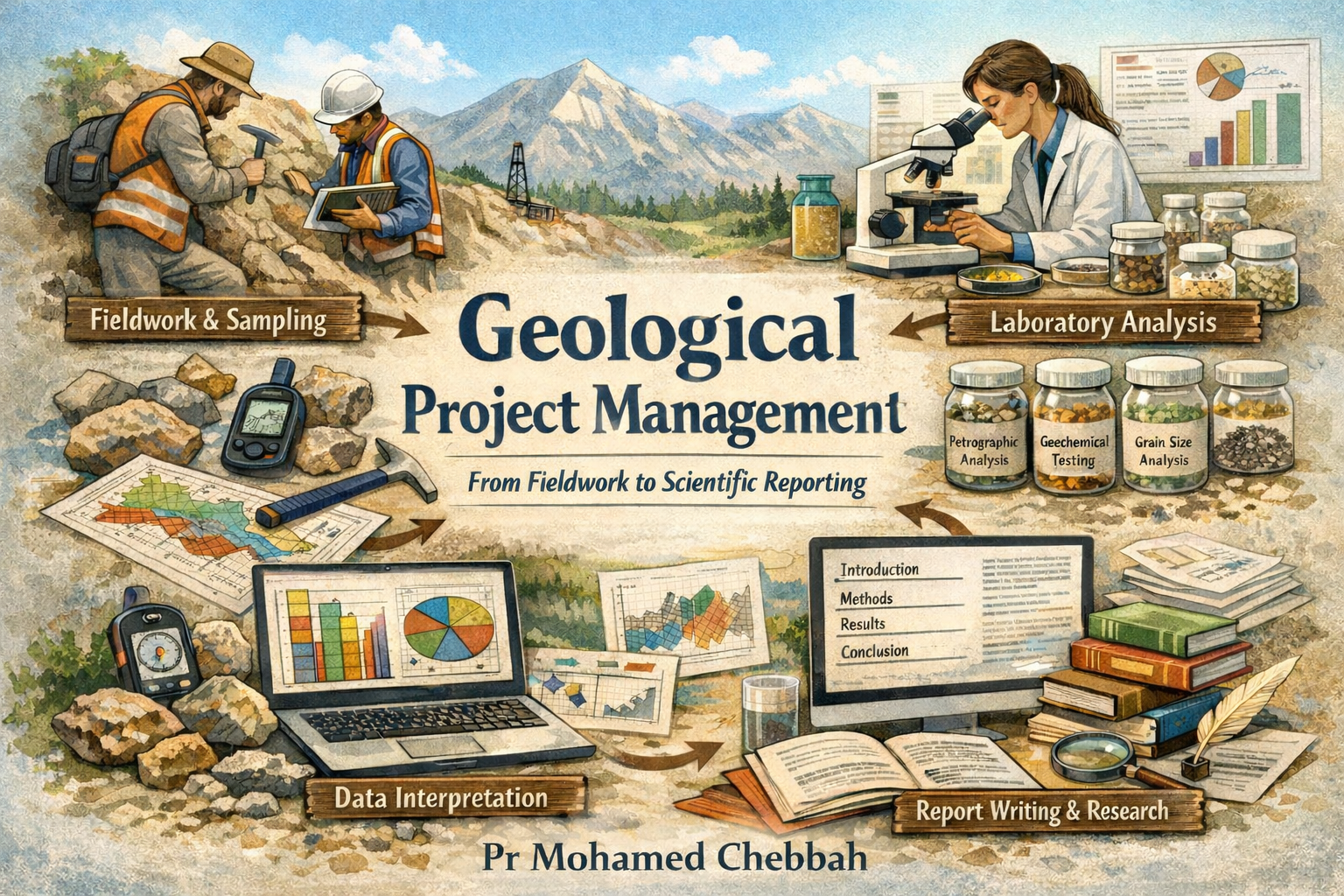 The project management course aims to teach students how to design, organize, and conduct a geological study project systematically and rigorously. It covers field methods such as using geological maps, recognizing facies, and sampling techniques (rocks, soils, sediments, water), along with organizing and planning fieldwork. Laboratory work is also addressed, presenting various geological analyses (petrographic, geochemical, grain size) and preliminary result interpretation. Students learn to process and analyze field and laboratory data, conduct bibliographic research using scientific databases, and write scientific reports following academic standards. Additionally, the course includes the translation and critical analysis of scientific articles in geology. By the end of the course, students will be able to design and carry out a complete geological project, interpret scientific data, find reliable information, and write clear and coherent reports.