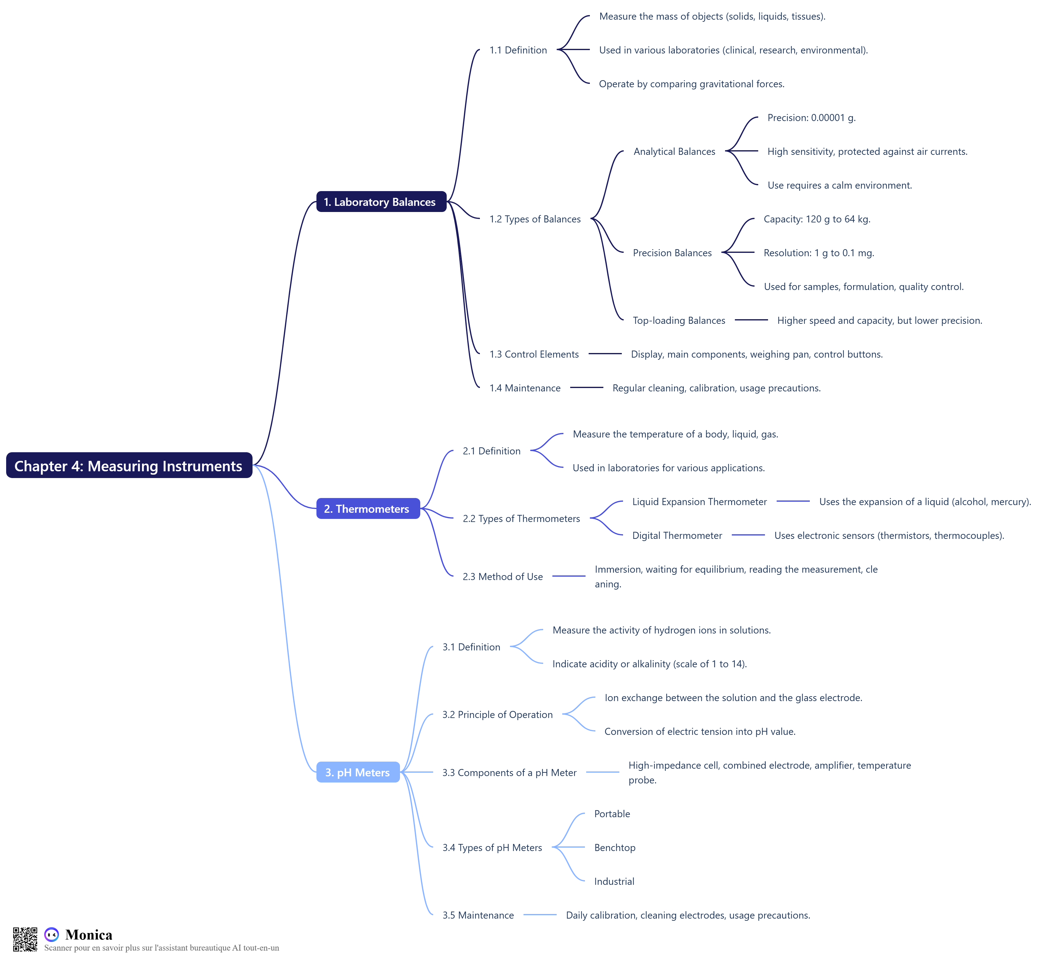 In this chapter, we explore the essential measuring instruments used in laboratories and various scientific applications. Understanding these tools is crucial for accurate measurements in experiments and research. We will delve into the functionalities, types, and maintenance of three primary instruments: laboratory balances, thermometers, and pH meters. Each of these instruments plays a vital role in ensuring precision and reliability in scientific measurements, enabling researchers to obtain valid results and make informed decisions based on their findings. This chapter aims to provide a comprehensive overview of these instruments, highlighting their importance in the field of science and technology.