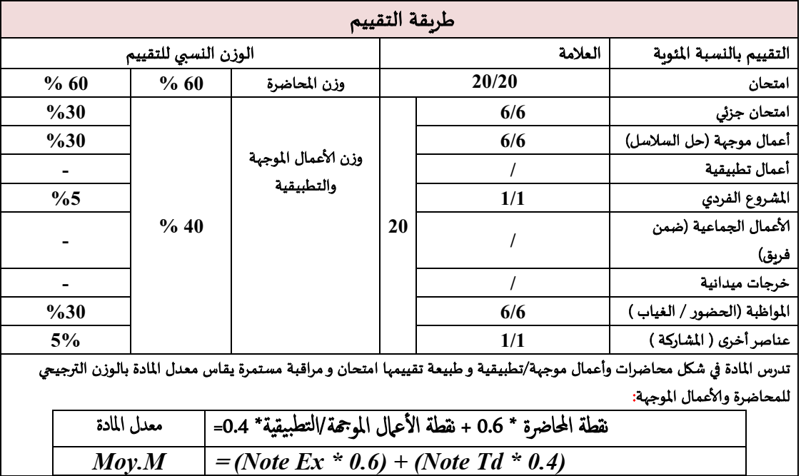طريقة التقييم : تقيم مستمر +امتحان نهائي ويقاس معدل المادة بالوزن الترجيحي للدروس(60%) والأعمال الموجهة (40%)