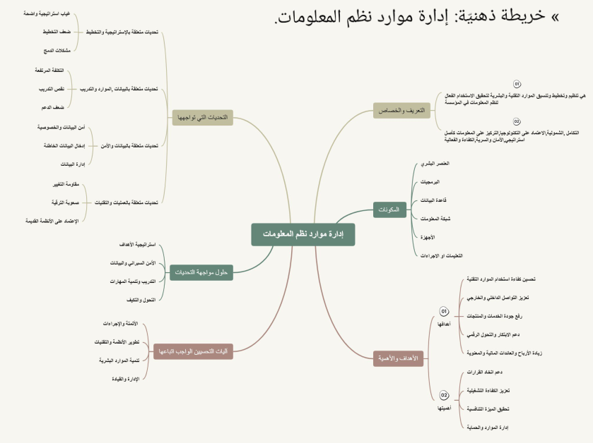 في إطار تشجيع الإبداع والتميز في ميدان التعلم النشط، تم إبراز كفاءة متميزة في محور إدارة موارد نظم المعلومات نظير إنجاز واجب البحث في شكل خارطة ذهنية احترافية عكست فهمًا عميقًا للمحاضرة، وتنظيمًا منهجيًا راقيًا للمفاهيم والمضامين الأكاديمية.
